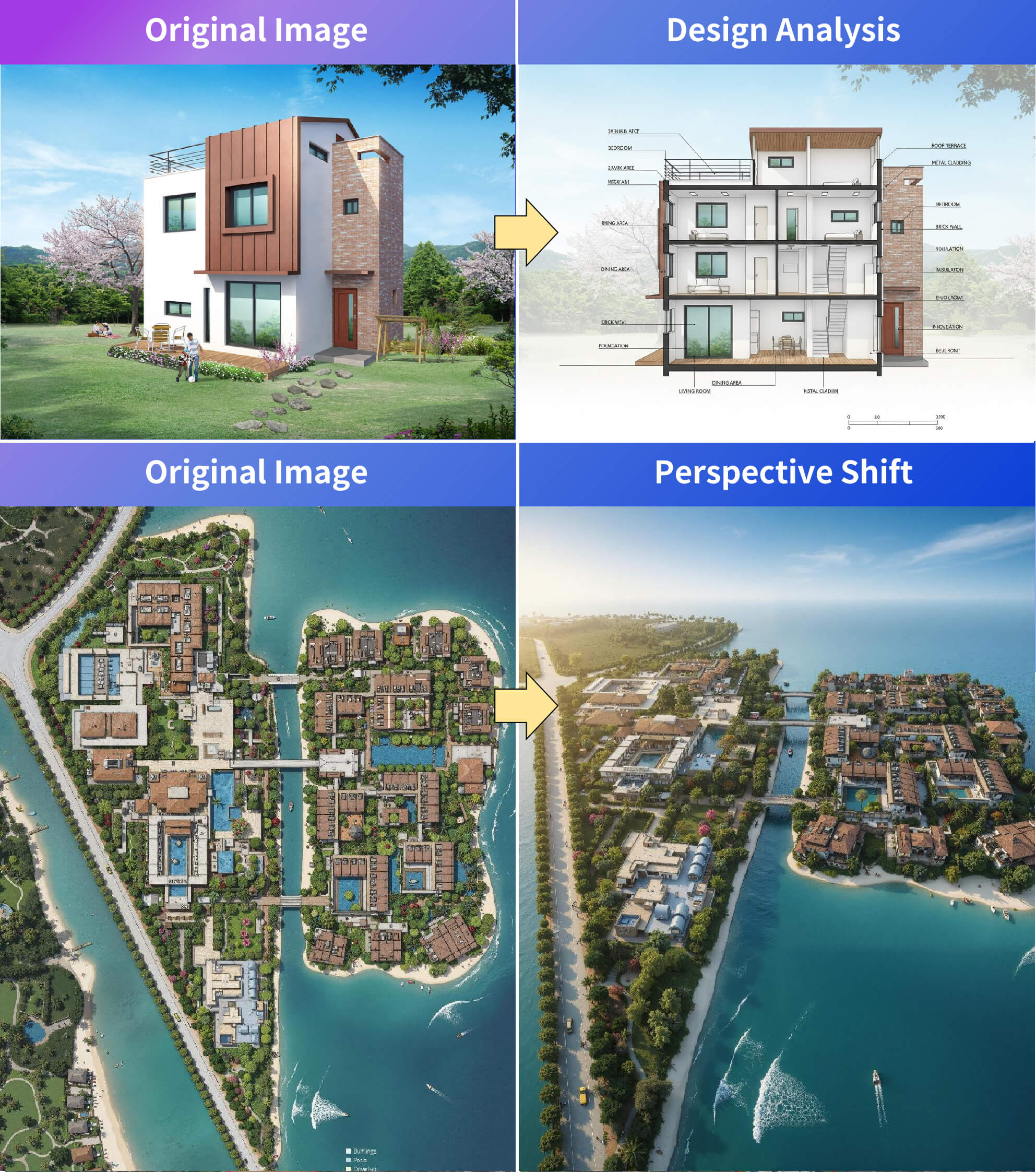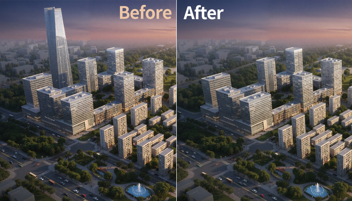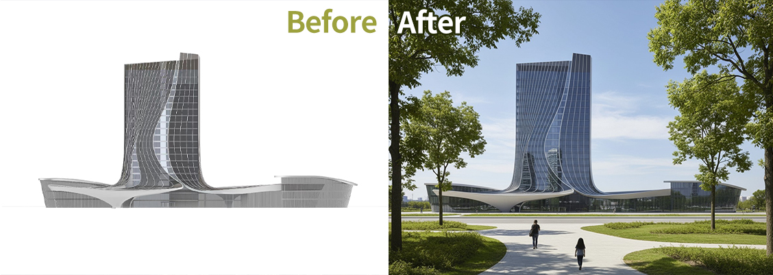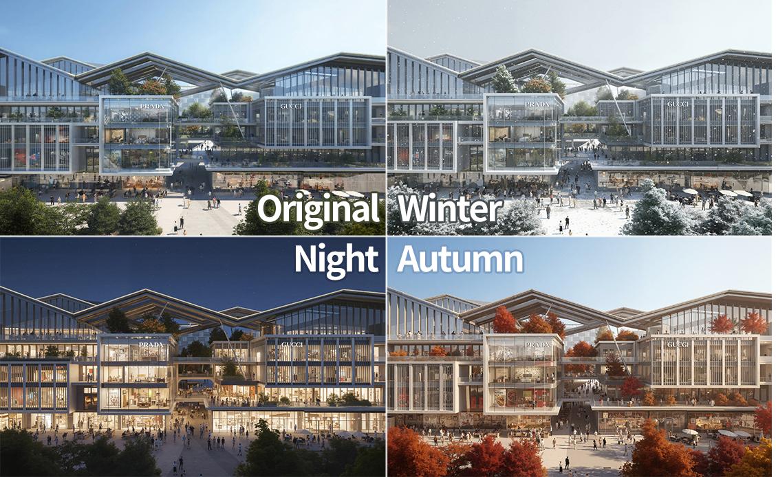 Precise Transformation changes the style, time of day, season, or weather of a rendering while preserving all original architectural details. Each variation expresses a distinct stylistic charm.