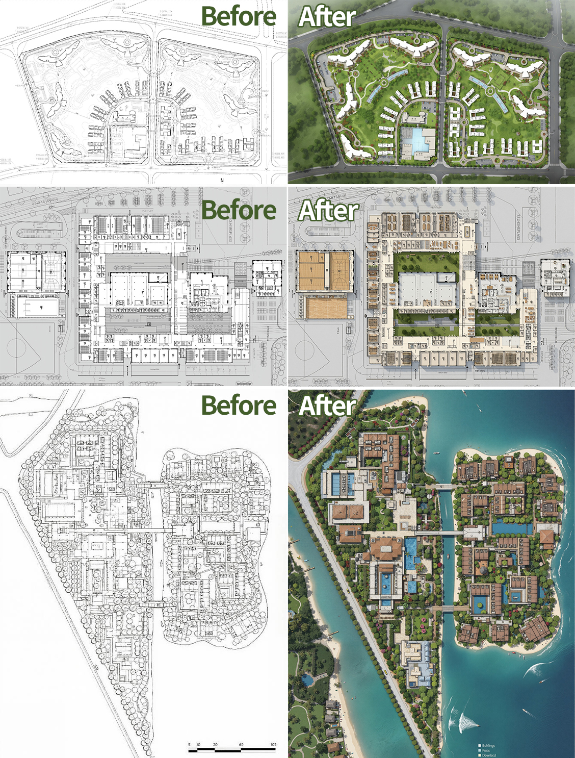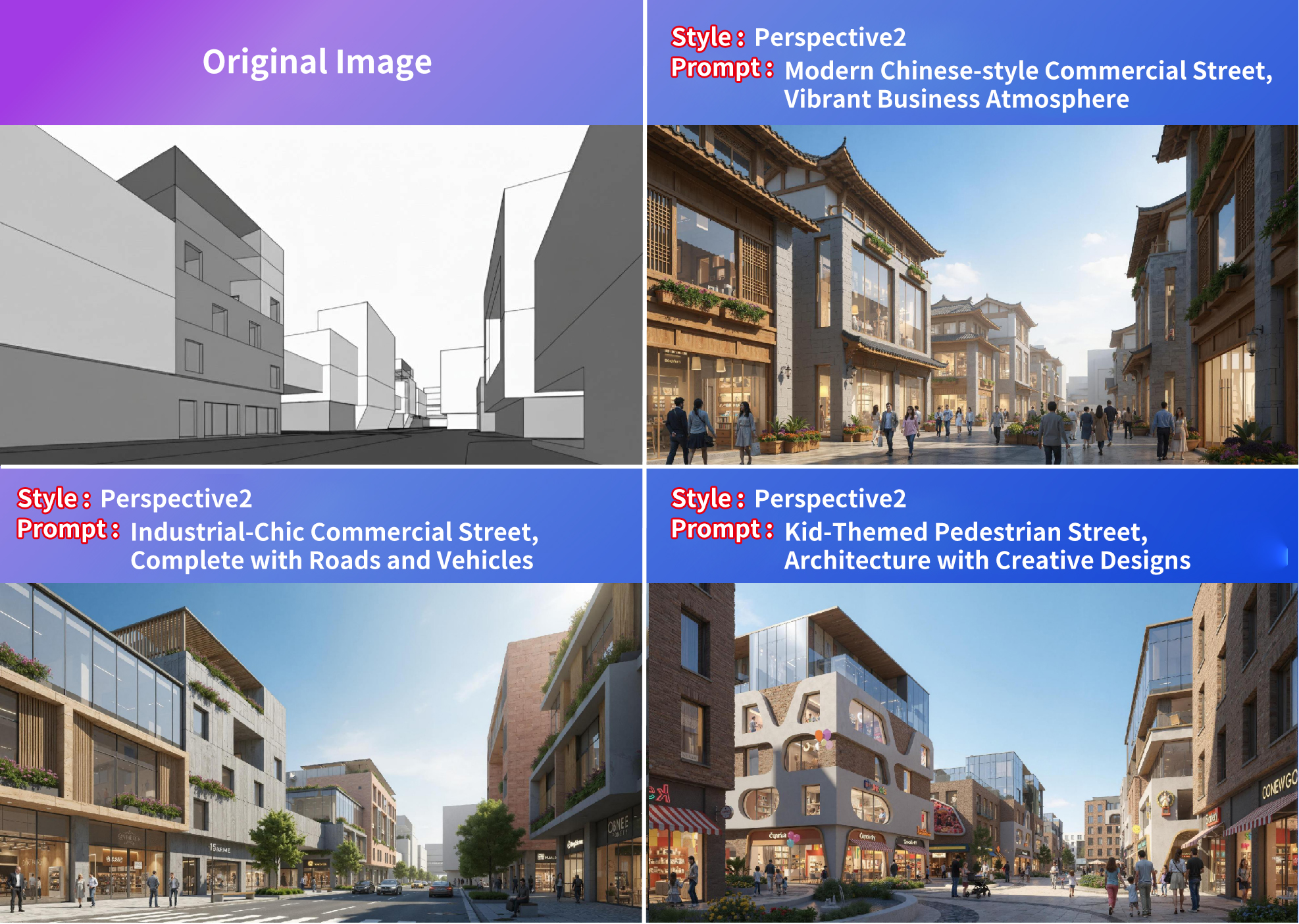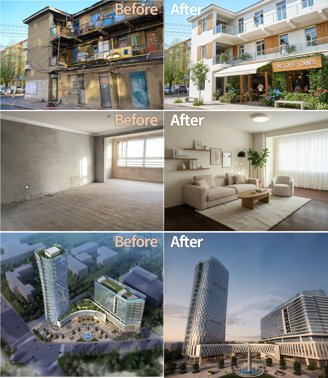 Precise Transformation changes the style, time of day, season, or weather of a rendering while preserving all original architectural details. Each variation expresses a distinct stylistic charm.