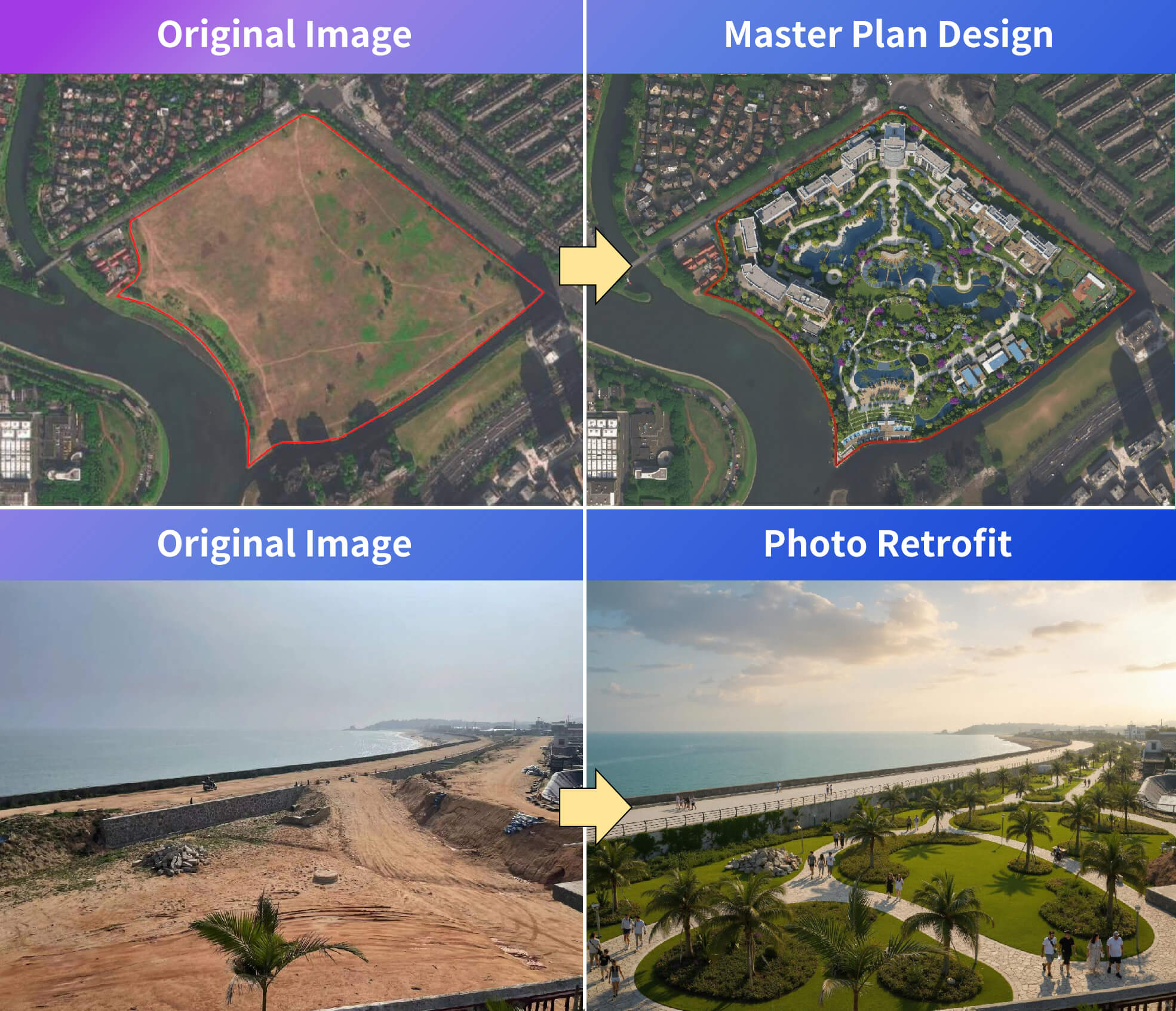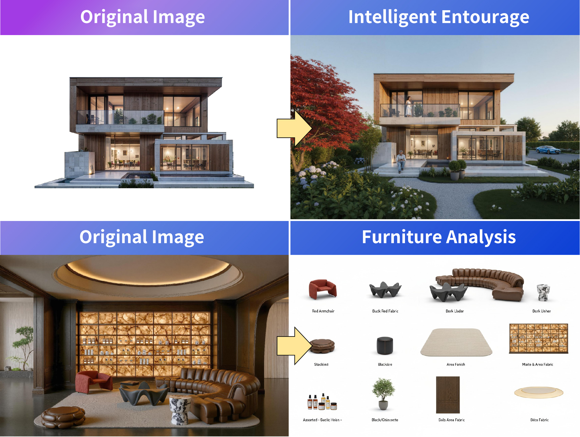 Smart Revision supports various creative workflows: intelligent context placement, soft furnishings analysis, master plan design, photo retrofit... Unlock your unique workflow today!