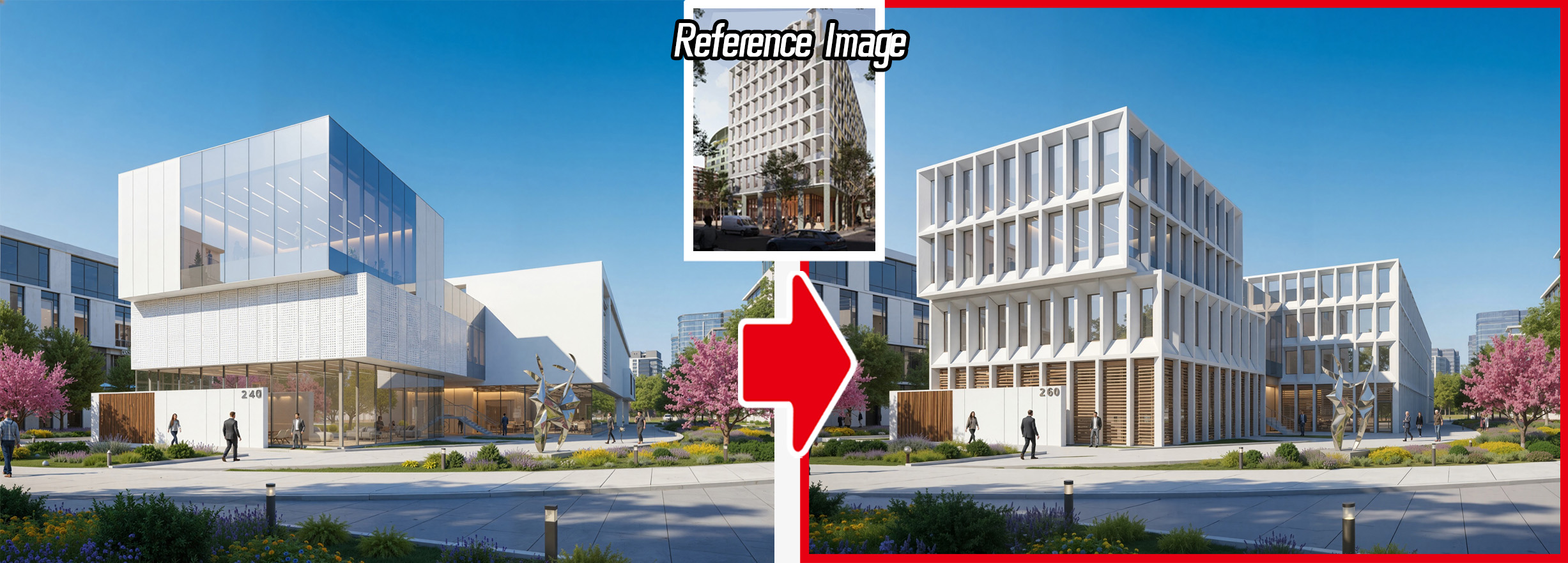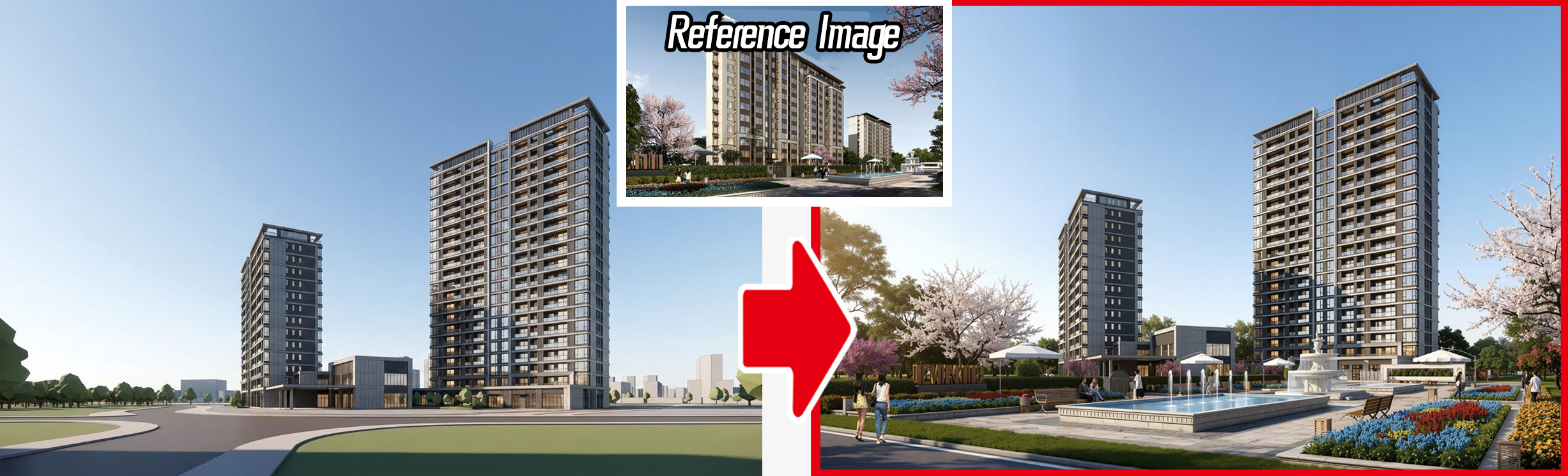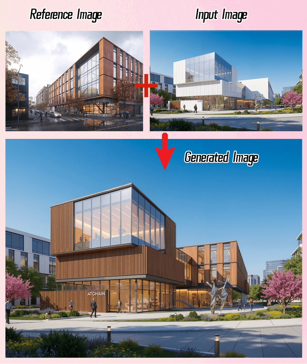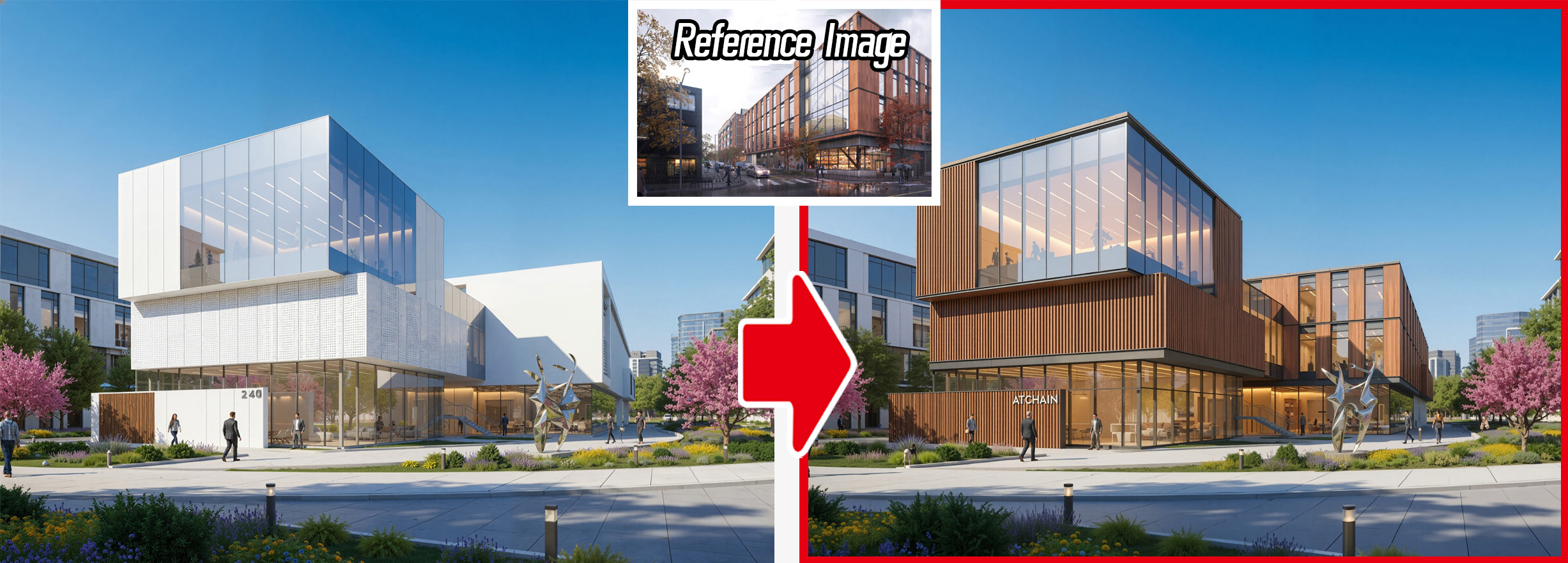 There are two ways to use architectural design style reference: The first way is local reference, which changes only the building's style while keeping the environment unchanged. This is more suitable for making localized modifications to a previously rendered image.