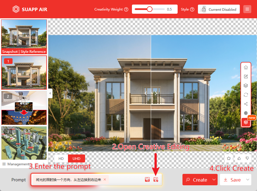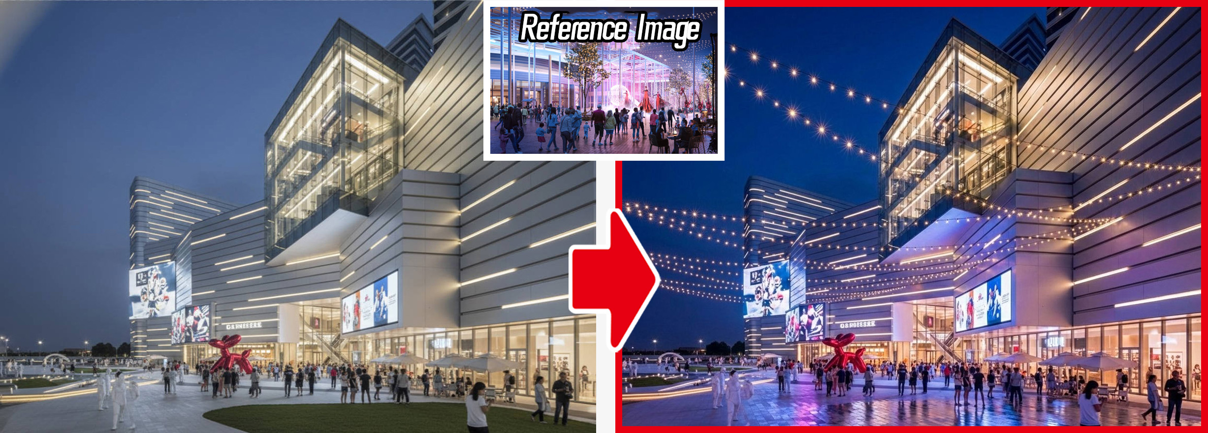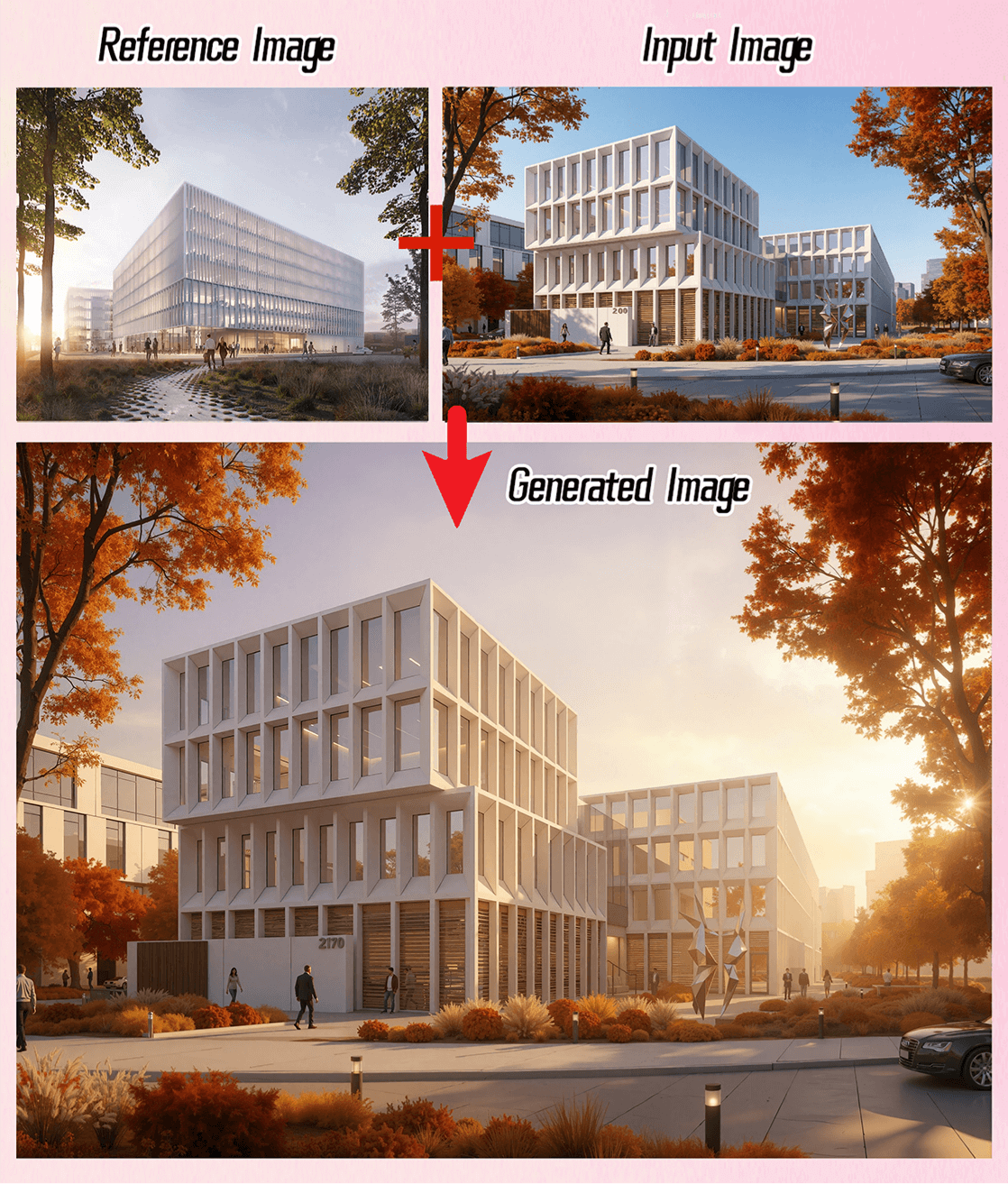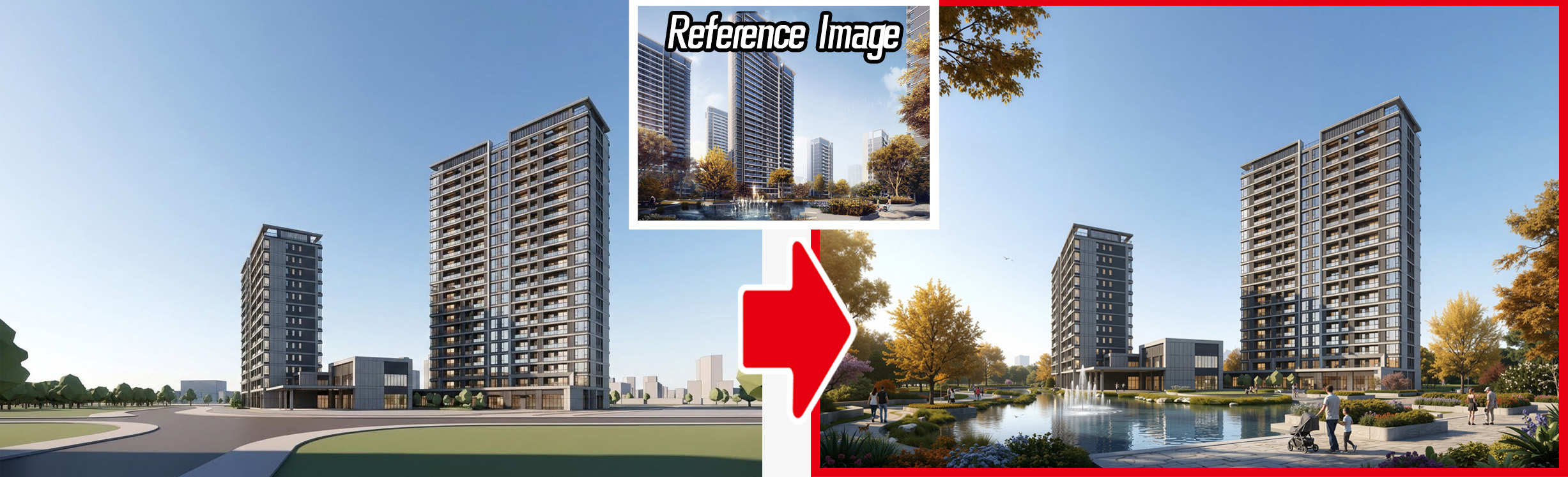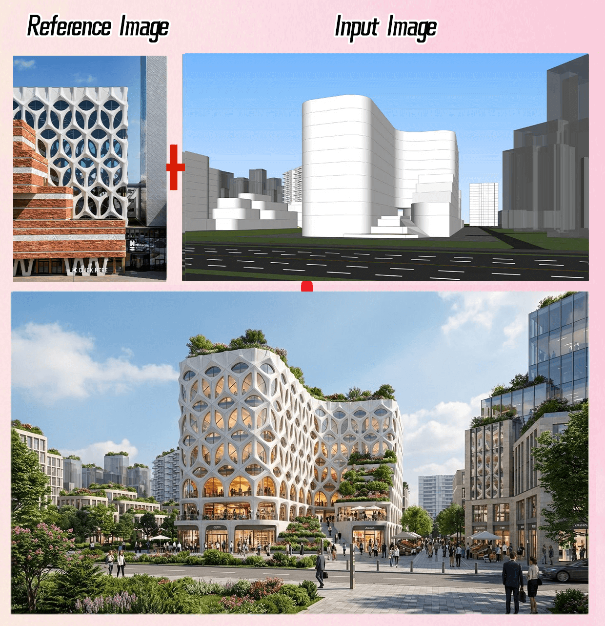 There are two ways to use architectural design style reference: The first way is local reference, which changes only the building's style while keeping the environment unchanged. This is more suitable for making localized modifications to a previously rendered image.