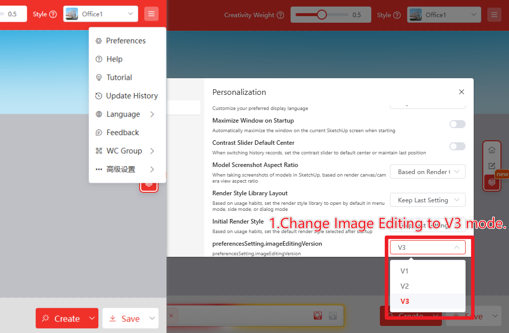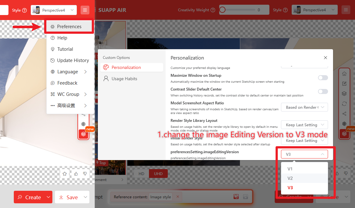 ① Find the Preferences in the upper right corner of the interface, and change the Image editing  version to V3.