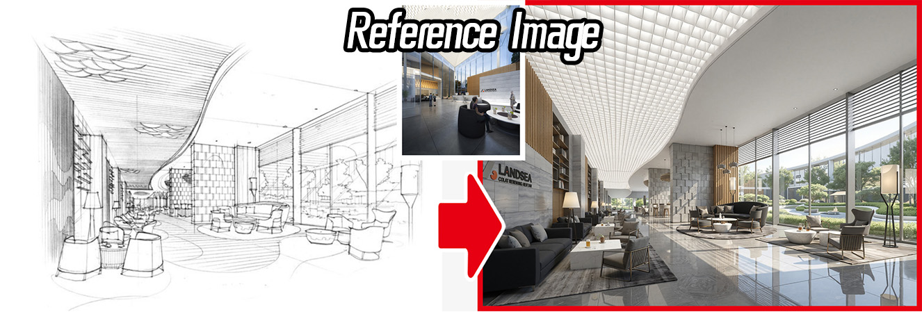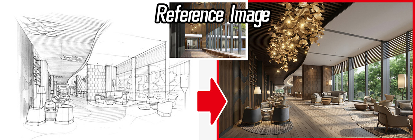 After importing the reference image and rendering, the overall style, materials, and architectural details of the generated image are similar to those of the reference image. It is suitable for overall reference rendering of plain models or sketches.
