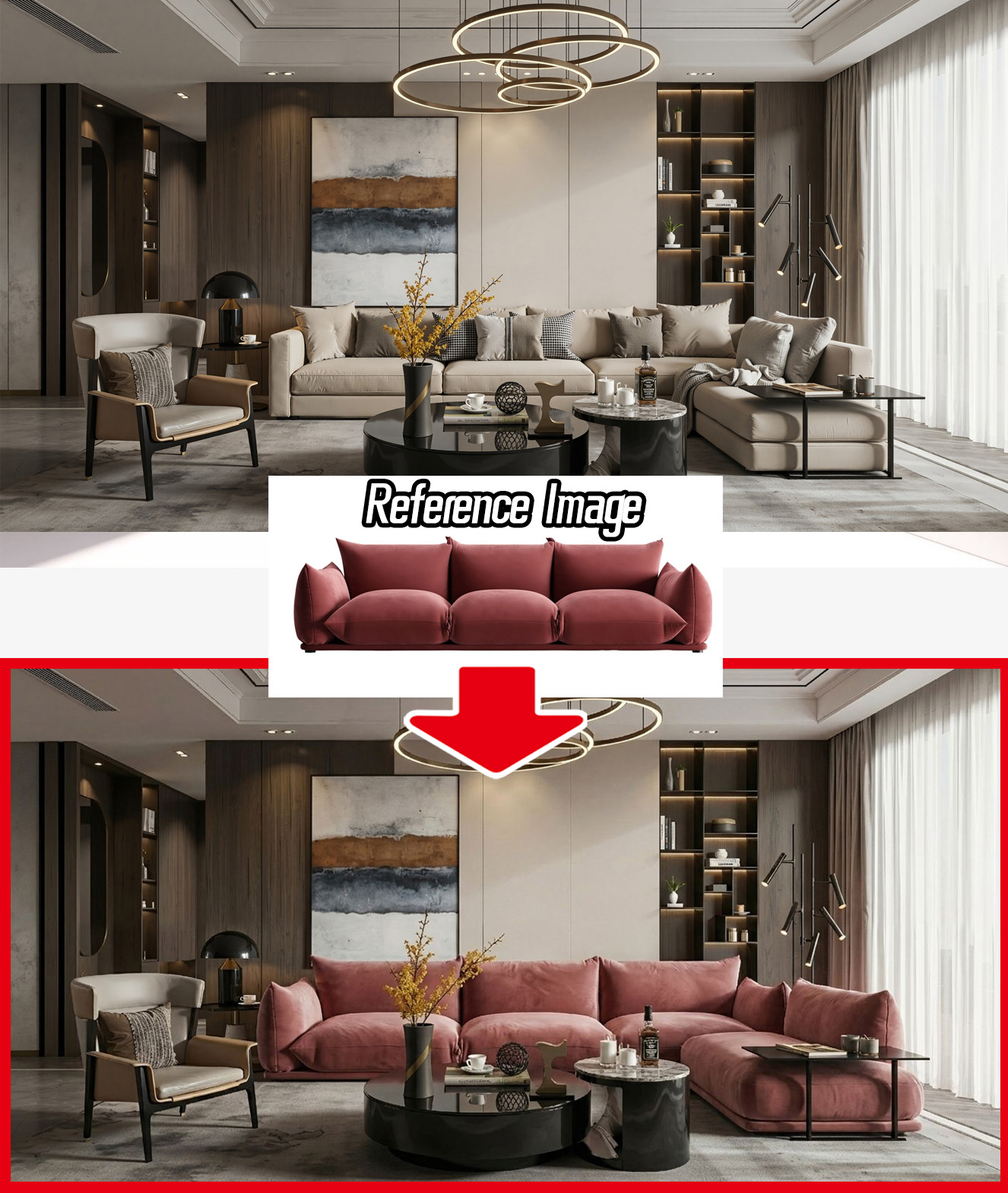 In addition to the preset reference contents above, you can also customize reference content. For example, import a sofa reference image and set the custom reference content as “sofa style”; the generated image will then only change the sofa style.