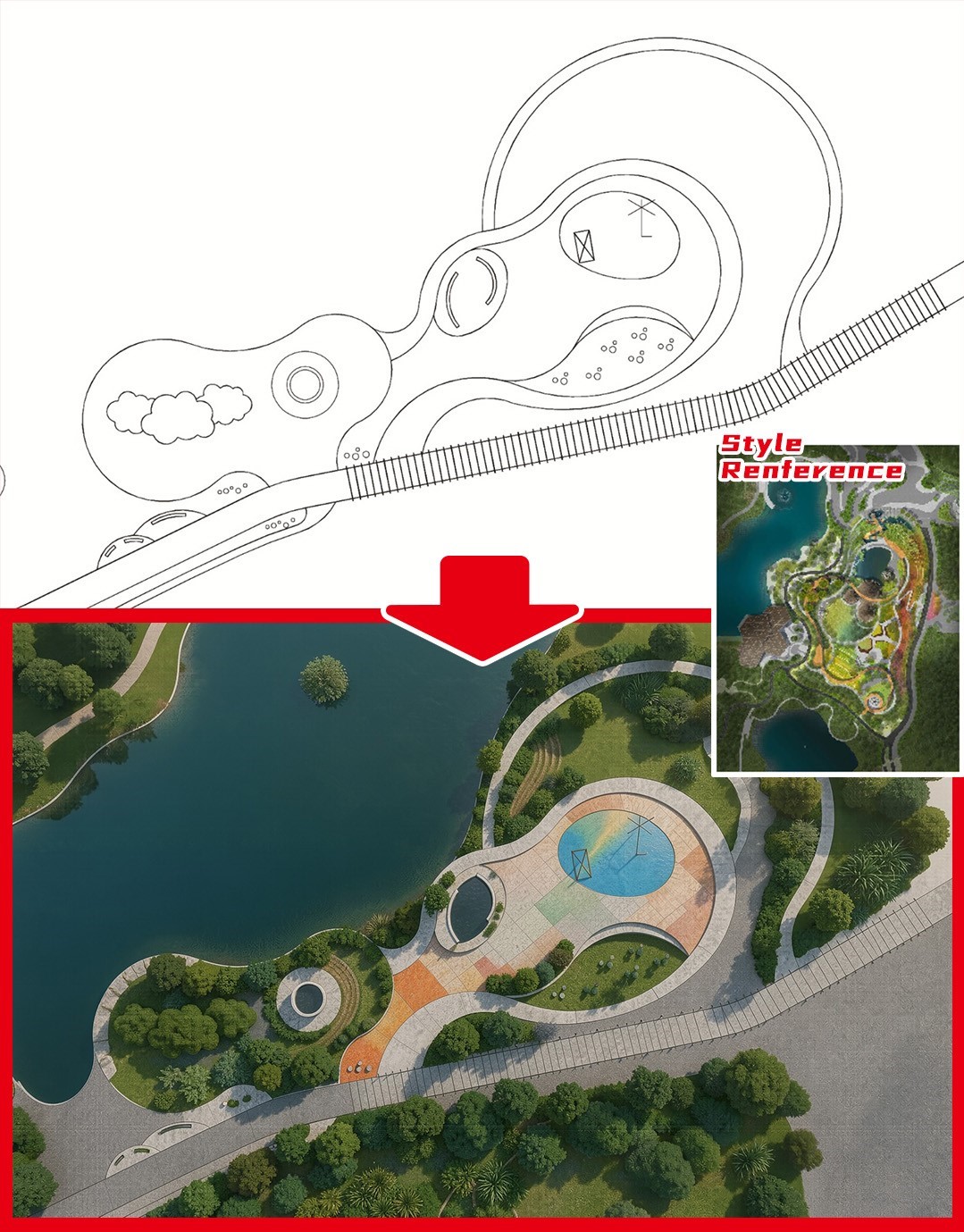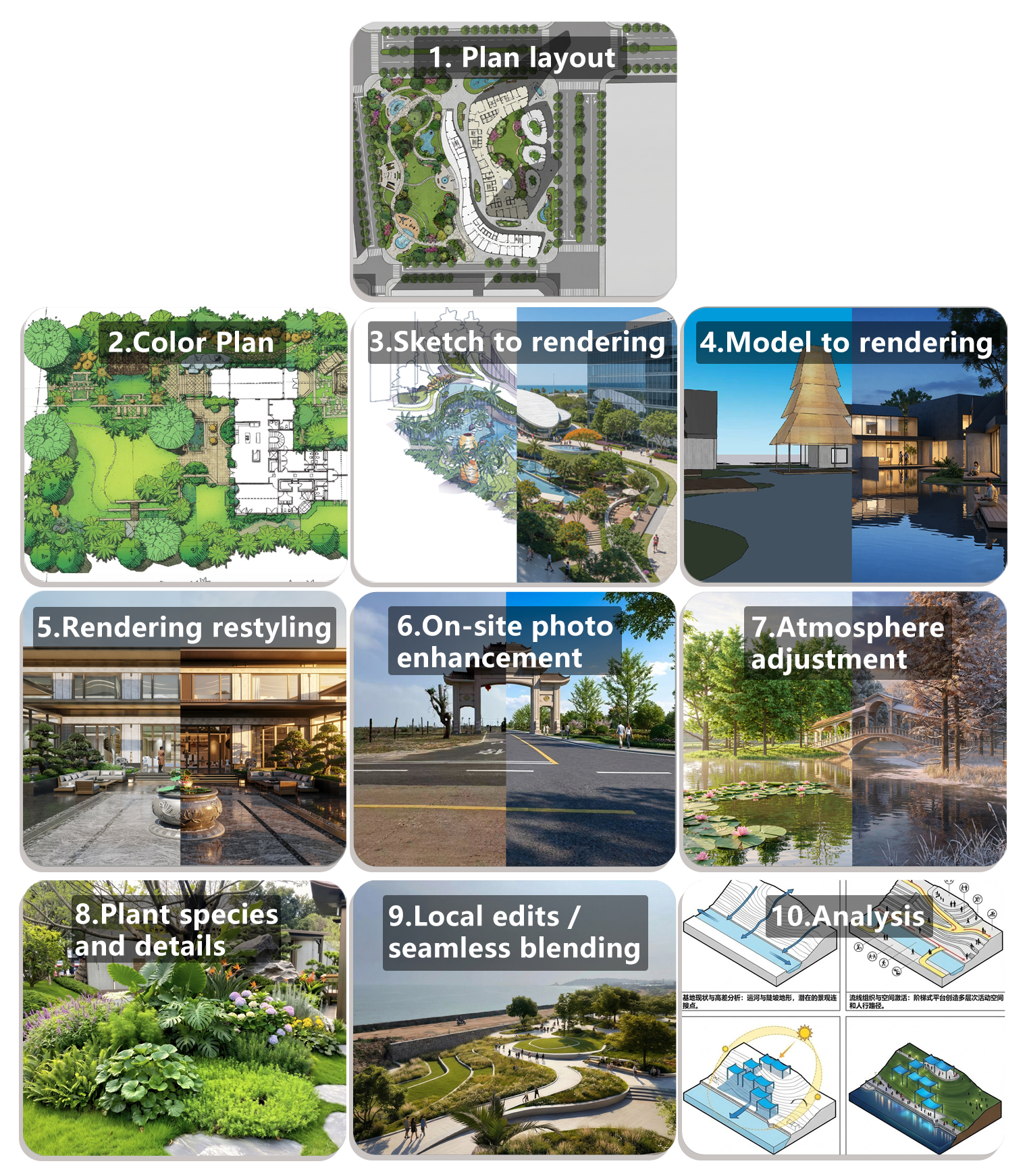 It doesn’t just generate renderings — landscape analysis diagrams can also be created with one click! Concept development, site analysis, circulation analysis, functional zoning... all can be visualized: