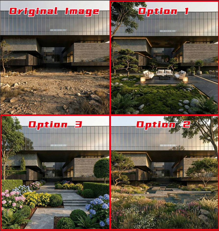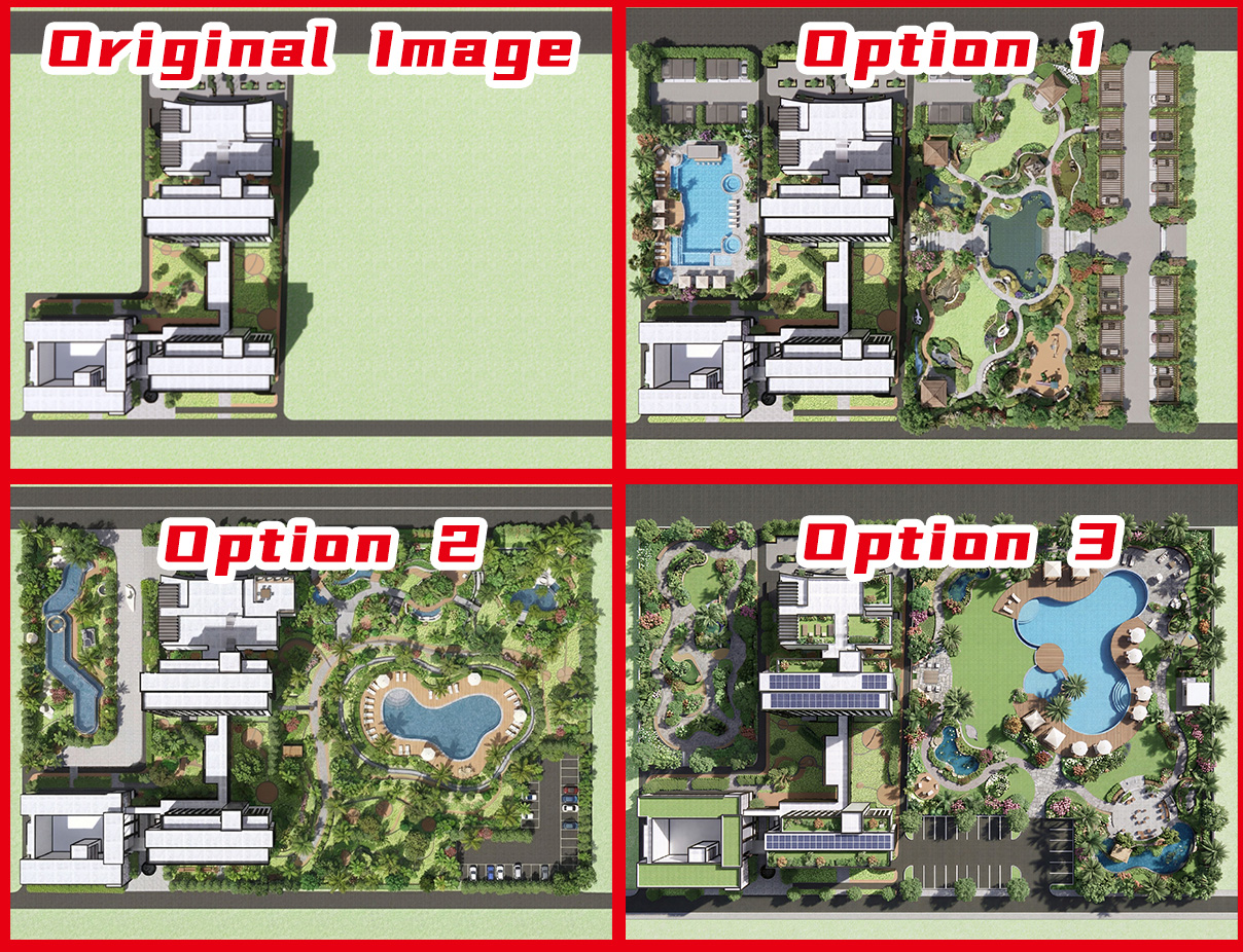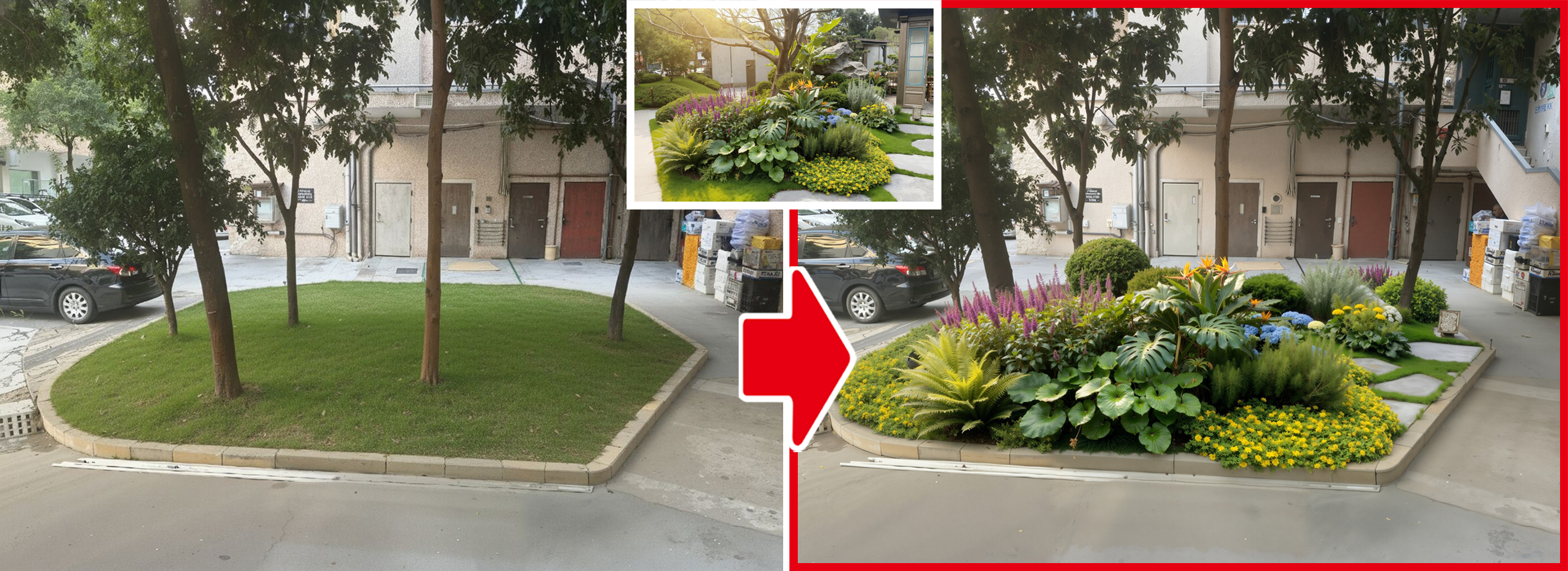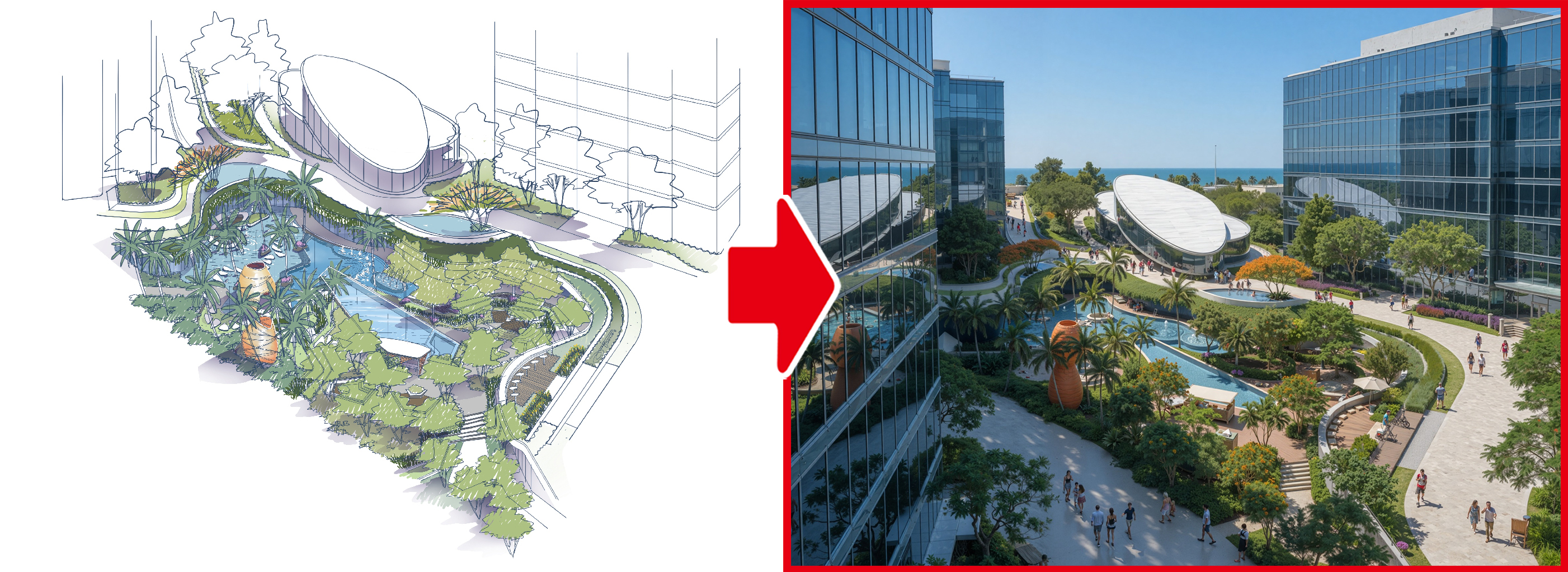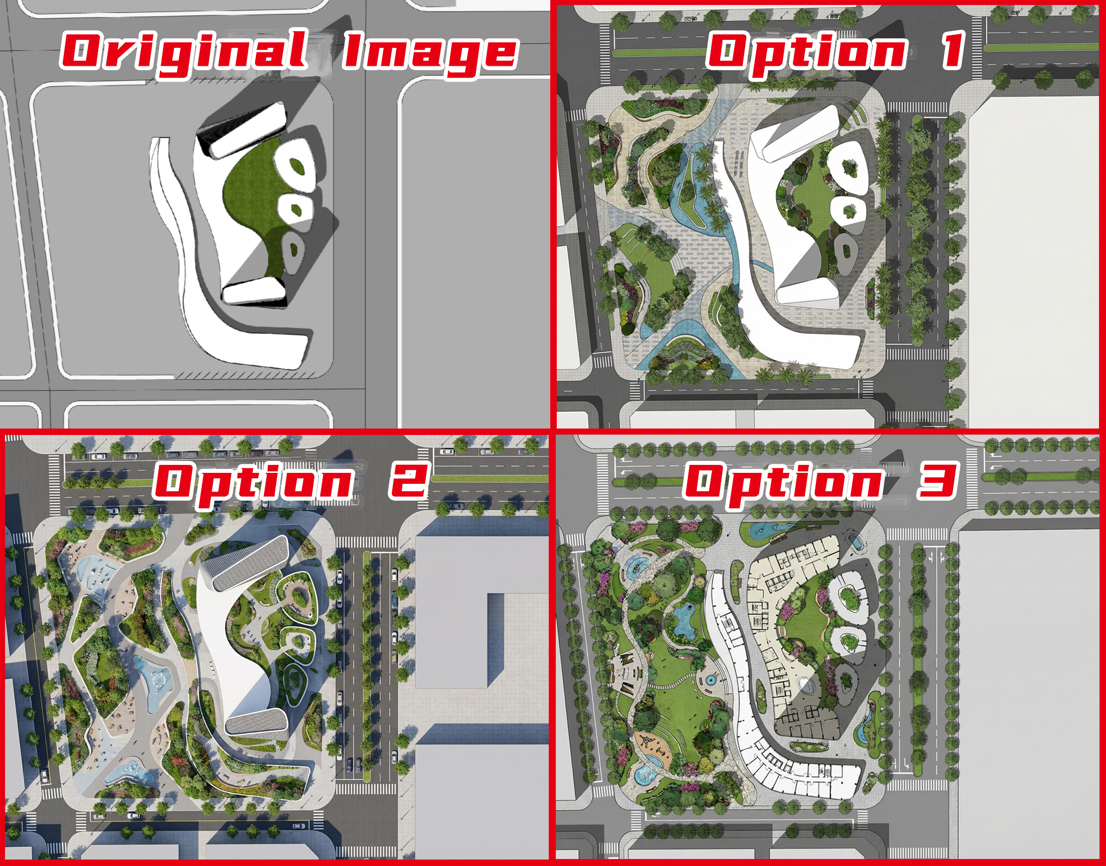 Working on a brownfield renovation? No need to remodel — just upload a photo of the site and start transforming! SUAPP AI preserves the original building and environment while seamlessly integrating new landscape designs: