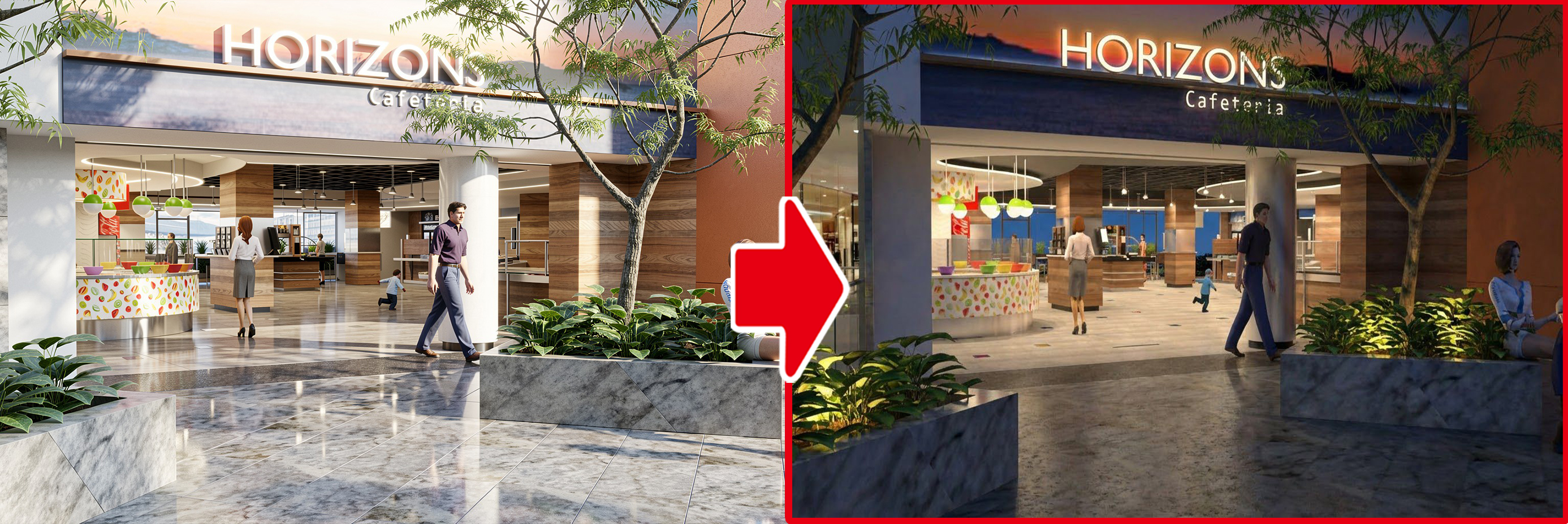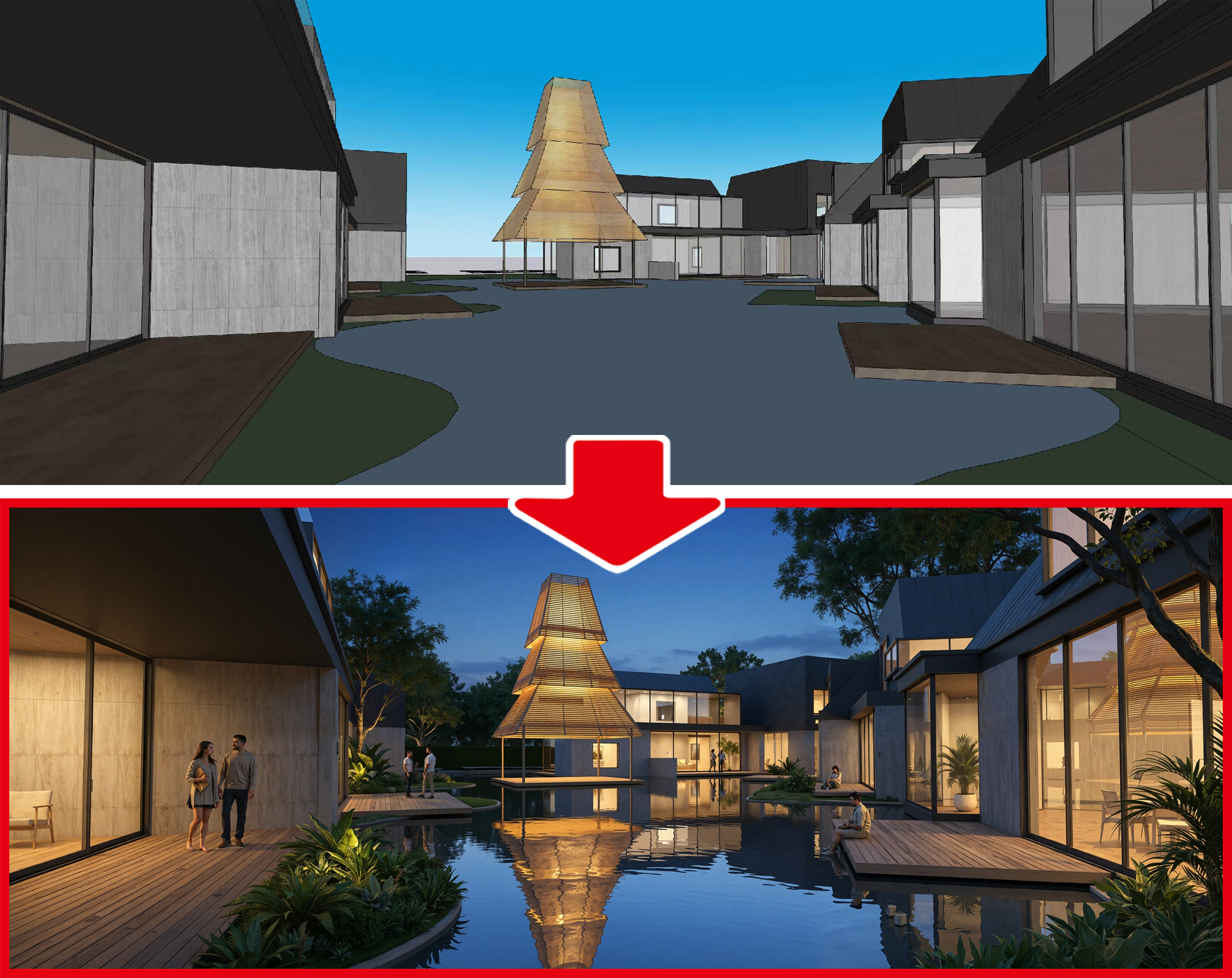 Preserves your original design while populating the scene with lights, plants, weather effects, people, interior glow, and other background details.