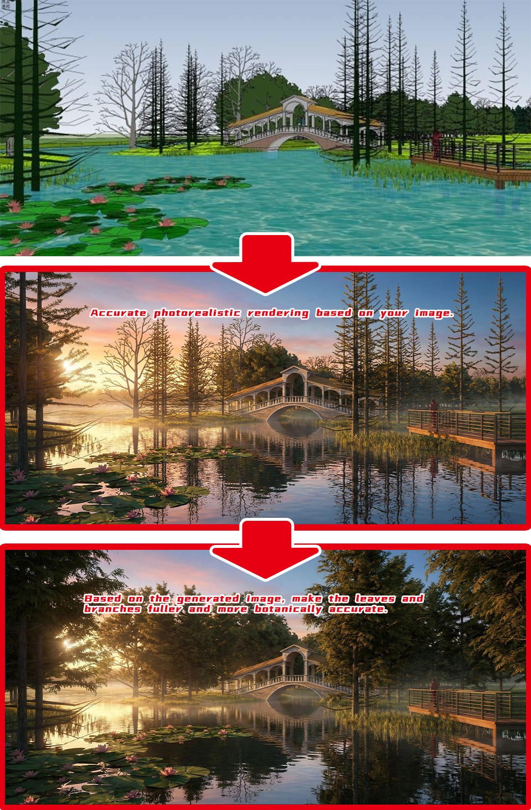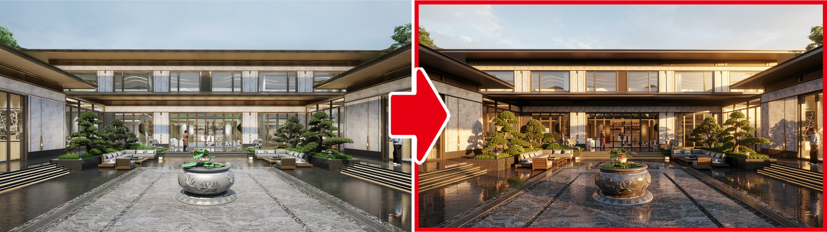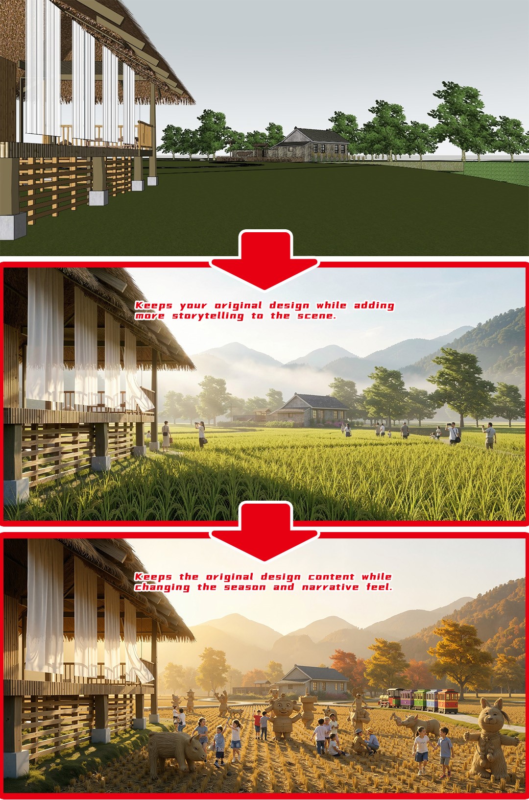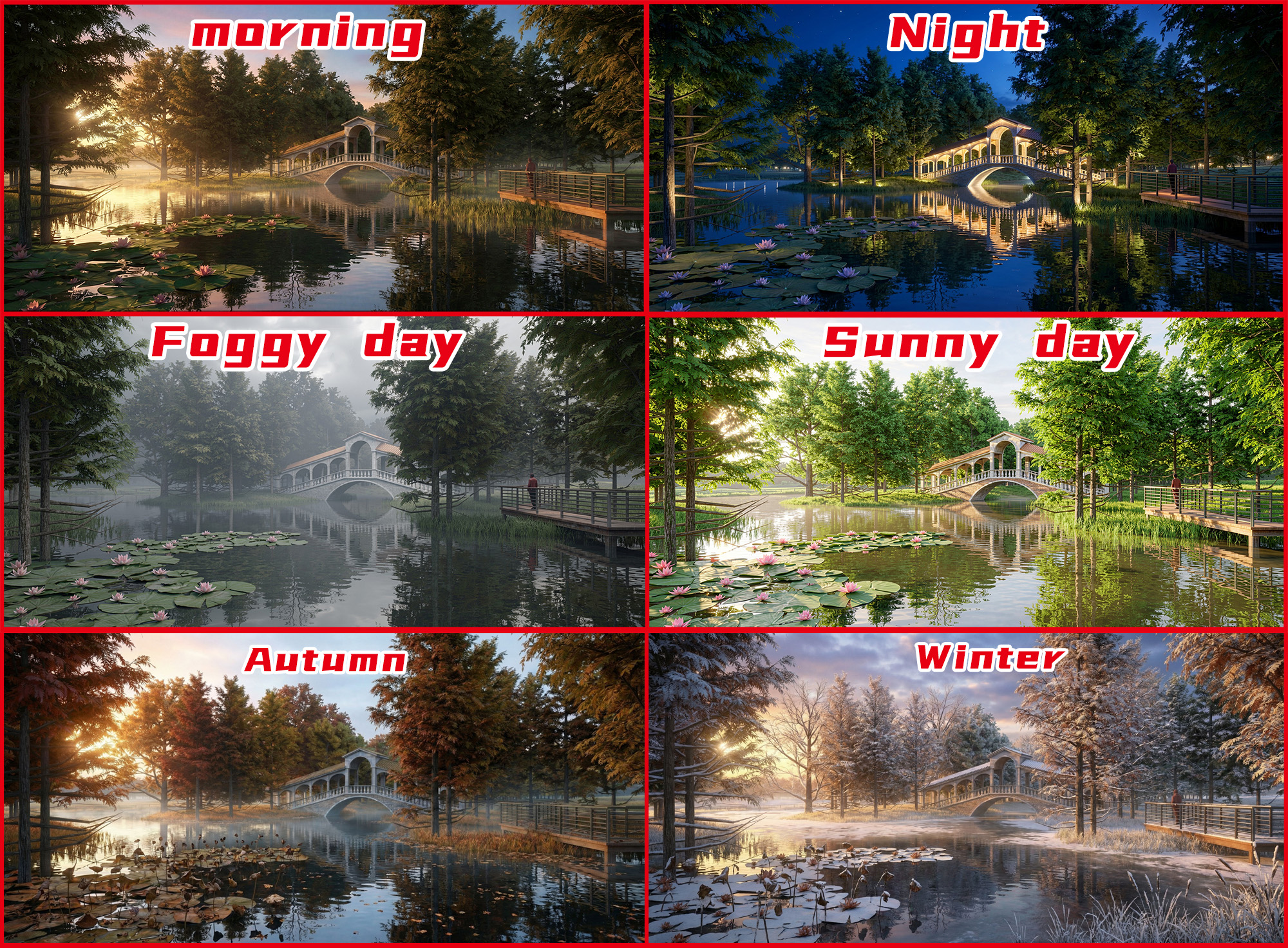Want to change the weather or season in your renderings? No need to re-render! Morning, night, foggy, sunny, autumn, winter — just one click to switch. Get multiple visual effects from the same design to meet different presentation needs.
