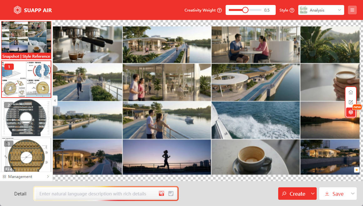 SUAPP Inspiration Assistant (SUAPP AIR), short for AI Render, is an AI-powered art rendering tool built by SUAPP specifically for designers. It redefines productivity in design visualization. With simple parameter adjustments, you can quickly generate “inspiration renderings” to support concept development — from mood boards and conceptual diagrams to final presentation images. While not a traditional renderer, it is powerful enough to act as a full replacement — dramatically speeding up your design workflow. Inspiration Assistant supports urban planning, architecture, landscape, interior design, color plans, physical models, hand-drawn illustrations, and more. With advanced AI that accurately preserves material textures and controls details, it seamlessly integrates into every stage of design — truly empowering you from idea to reality.