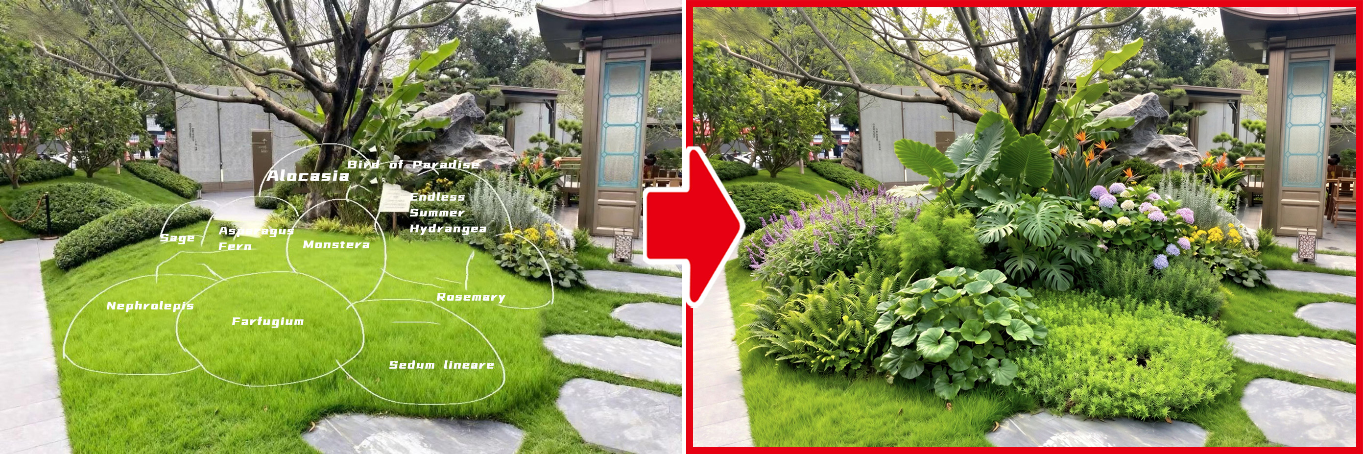 Just scribble on the image and enter the plant name — AI will automatically create a well-matched plant cluster for you.