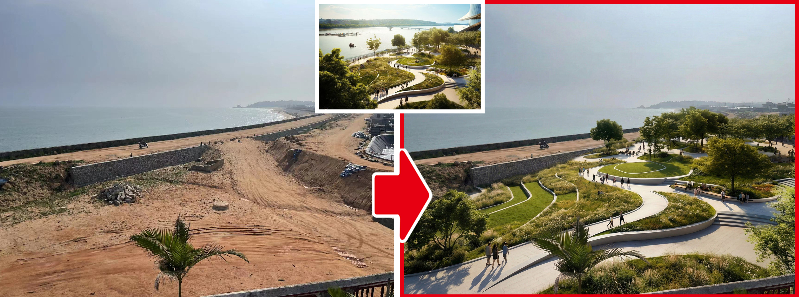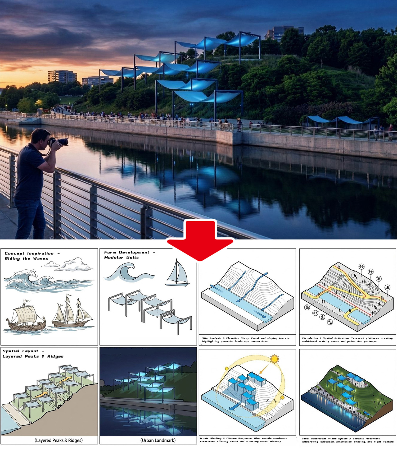 From concept evolution to elevation analysis of a canal slope, circulation design of terraced platforms, shading design with tensile membranes — finally presenting a vibrant waterfront. The design logic is strikingly evident.
