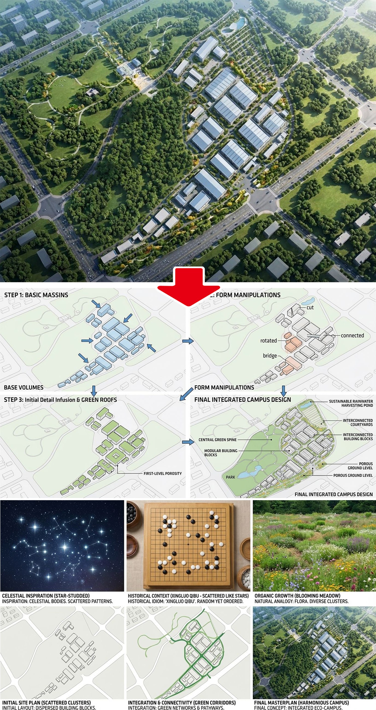Inspired by natural leaf veins — abstract form evolution, branching network structures, creating a 'forest-integrated' settlement layout. The design concept blending industry and ecology is clear at a glance.