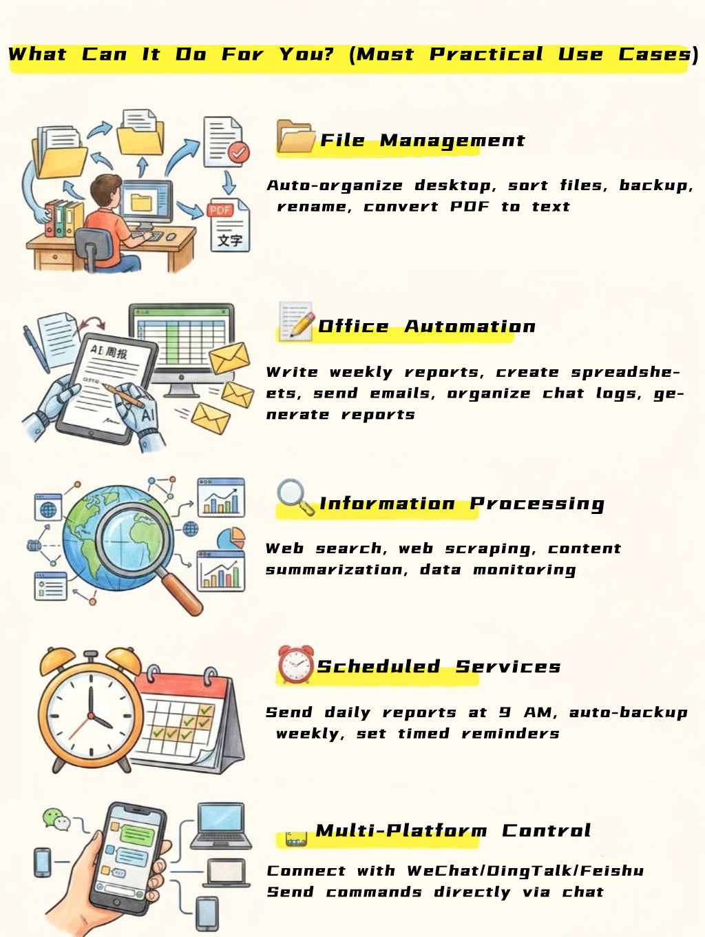 Meet Lobster OpenClaw—a revolutionary AI 'doer.' Its core strength lies not just in interpreting commands, but in executing actions on your computer, just like you would. Think of it as your dedicated 24/7 digital assistant, always ready to help. Use it to monitor stocks, gather news, schedule your day, auto-organize work files... the possibilities are endless.