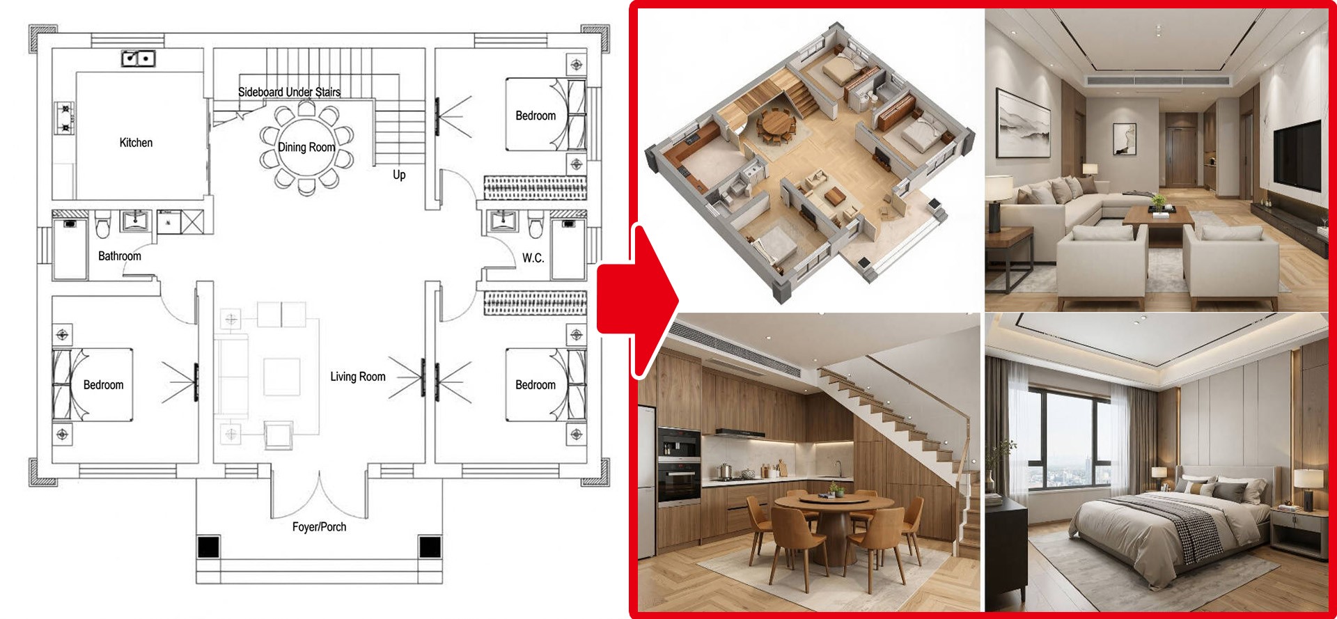 ④ Click Render — interior render generated instantly