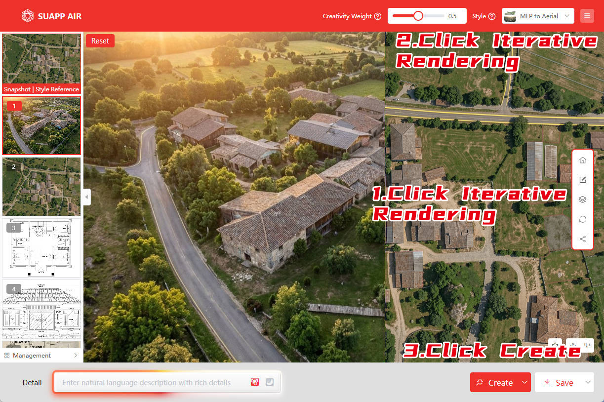 ① Click "Iteration"② Select "Lingxi V2 - Camera Switch - MLP Aerial" style③ Click Render — aerial view generated instantly