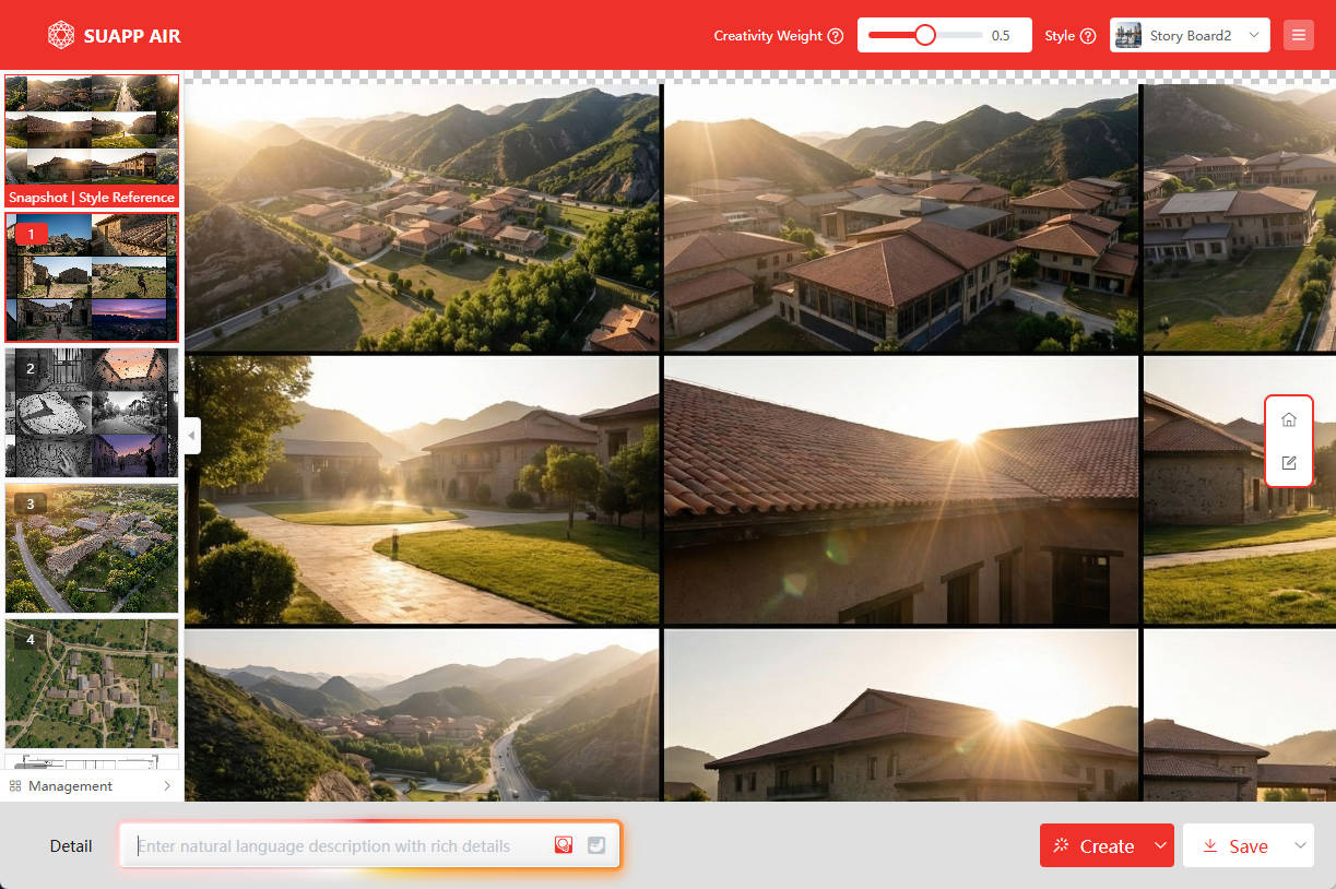 The generated aerial view can be further iterated to create renders from different perspectives. Simply select any style under "Lingxi V2 - Smart Edit - Camera Switch" to generate a variety of scene visuals with just one click.